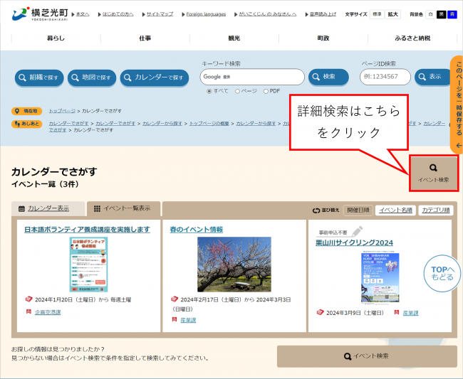 イベント検索をクリックすることでカテゴリーや詳細検索を利用することで情報を確認することができます。