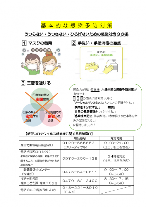 再度、新型コロナウイルス感染症について、正しい知識を身につけて、「うつらない・うつさない・ひろげない」ための感染対策を心がけましょう。